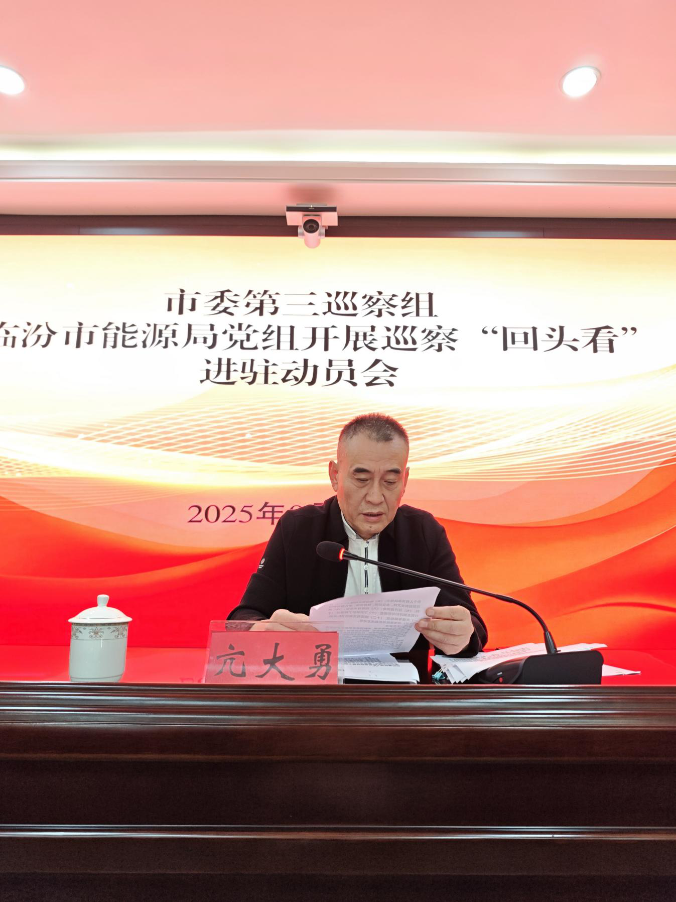 亢大勇组长从本轮巡察的重要意义、工作重点、工作方式、工作要求等方面做了动员讲话。他强调,要深刻认识到巡察是坚持和加强党的领导、推动党的路线方针政策落地落实的必然要求;是坚定有序推动转型发展、推进中国式现代化临汾实践的重要抓手;是坚定不移推进全面从严治党、全面建设清廉临汾的有力举措。市能源局要坚决扛牢管党治党政治责任,紧紧围绕“四个聚焦”监督重点深入开展自我检视,积极为巡察组了解情况、发现问题创造条件、提供帮助,对巡察前自查的问题,要闻风而动、即知即改;对巡察中指出的问题,要扭住不放、立行立改;对巡察后反馈的问题,要统筹研究、彻底整改,把接受巡察作为发现问题、消除隐患、推动工作的重要契机。市能源局领导班子成员要发挥表率作用,带头查摆问题,党员干部要提高认识、端正态度,如实向巡察组反映情况,积极主动配合巡察组开展工作。